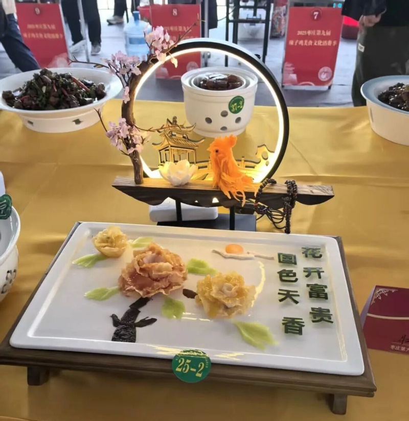 山东鲁南人才服务有限公司参赛队伍自报名以来,便高度重视此次比赛,比赛当天操作台前始终吸引着众人的目光。随着油温升高,鸡块下锅翻炒,滋滋作响,香气瞬间弥漫开来;随后加入辣椒、花椒等调料,火候的精准把控让每一块鸡肉都充分吸收了调料的香味,色泽红亮诱人,口感外酥里嫩,辣而不燥,鲜香味美。