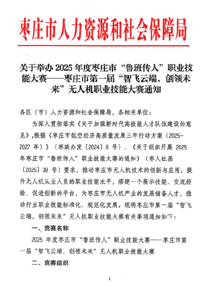 关于举办2025年度枣庄市“鲁班传人”职业技能大赛--枣庄市第一届“智飞云端,创领未来”无人机职业技能大赛通知